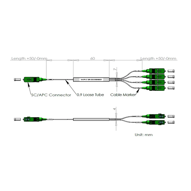 1 × 8 PLC Splitter Steel Tube-paket 60x7x4mm, med 900 um löst rör 1,0 och 0,75+0,05/-0 m, SC/APC-kontakt.